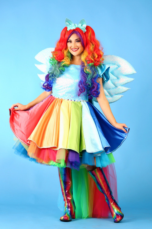 This Rainbow character will be sure to bring a splash of color to your party! She is inspired by the “my little pony’ theme, but she is great for any rainbow themed event! From her colorful hair to her rainbow outfit, she’ll have you smiling from head to toe!