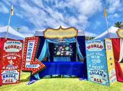 Includes tent, setup, games, prizes and a character leading for 1hr. Day rental is $1500, Includes a costumed character leading the game, each additional hour is $125 for the character.